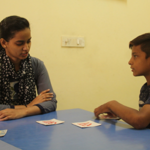 At this stage we start with simple sounds like ‘aa’, ‘ee’, ‘oo’ etc. and gradually move towards simple words and then sentences. One must also keep in mind that it is important to repeat lessons again and again so that they are reinforced in the child’s mind. This is a slow process, and one needs to be patient, and not lose interest in case the child does not learn quickly. Teachers and parents must reward progress and attempts, and never scold or get angry if the child is playful and does not want to study.